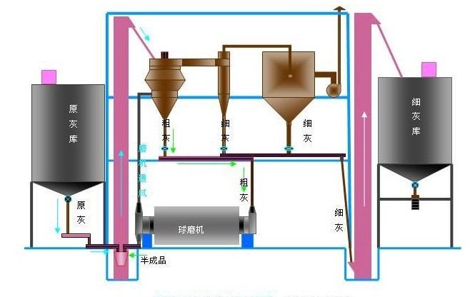 粉煤灰磨細(xì)、分選工藝說(shuō)明:粉煤灰粉磨系統(tǒng)主要由原灰倉(cāng),葉輪給料器、電子計(jì)量稱(chēng)、粉煤灰專(zhuān)用球磨機(jī)、選粉機(jī)、氣箱脈沖布袋除塵器、引風(fēng)機(jī)、螺旋輸送機(jī)、斗式提升機(jī)、給料機(jī)、控制系統(tǒng)等組成。系統(tǒng)直接由原灰倉(cāng)下取灰,經(jīng)葉輪給料器給料,電子稱(chēng)稱(chēng)重后由螺旋輸送機(jī)輸送進(jìn)入磨尾提升機(jī),粉煤灰由提升機(jī)喂入選粉機(jī)進(jìn)行磨細(xì)前的分選,分選后的粗灰經(jīng)螺旋輸送機(jī)送入磨機(jī)進(jìn)料口,進(jìn)入球磨機(jī)研磨,經(jīng)磨機(jī)研磨后的物料中含有大量細(xì)灰,再次由提升機(jī)喂入選粉機(jī)分選,分選出的細(xì)灰經(jīng)后續(xù)螺旋輸送機(jī)送入成品灰?guī),磨機(jī)通風(fēng)除塵與選粉機(jī)細(xì)粉布袋除塵器共用;采用此種閉路研磨工藝與開(kāi)路(無(wú)選粉機(jī))系統(tǒng)相比可提高臺(tái)時(shí)產(chǎn)量30~40%以上。